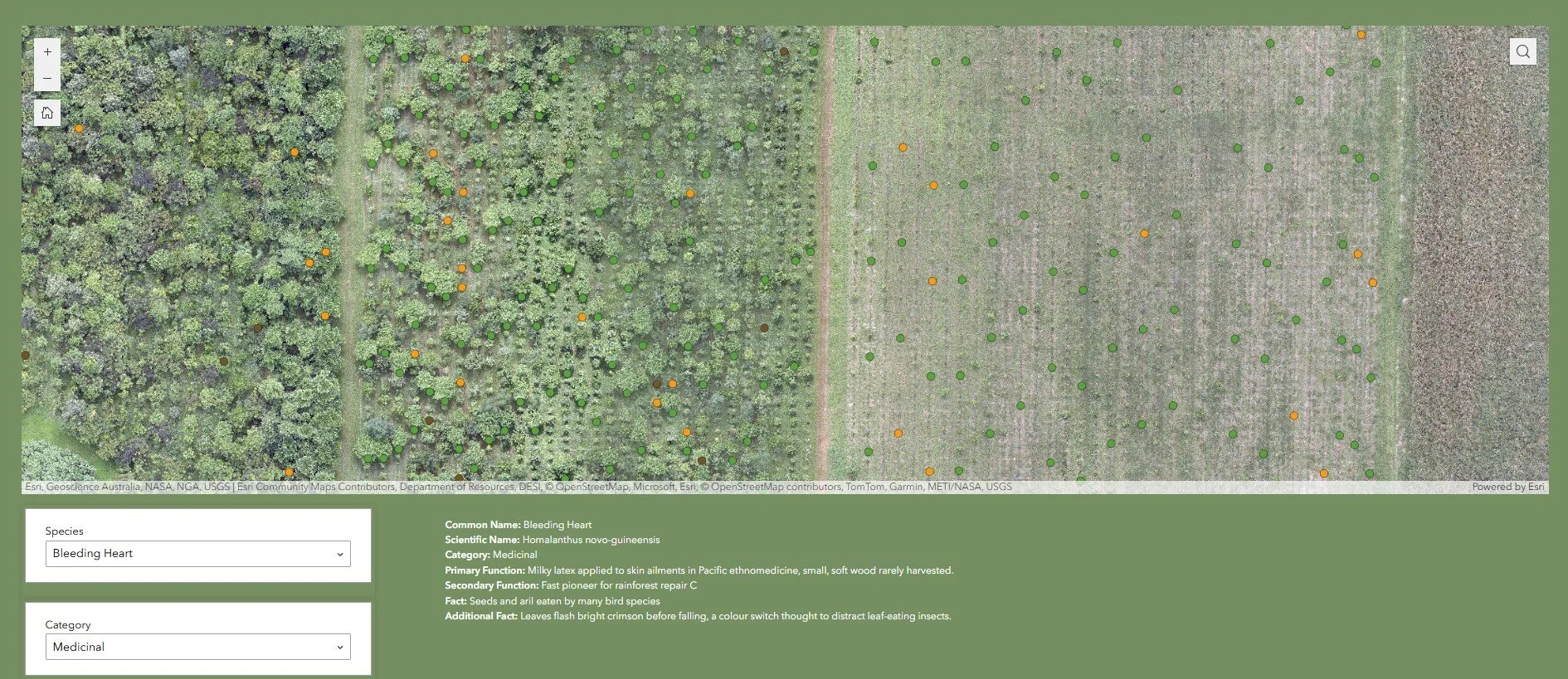 This tab is where our inner plant nerds (and proud of it) come alive. The Species tab lets you dive into every species we’ve planted across our restoration zones — from rainforest giants to lesser-known support species.